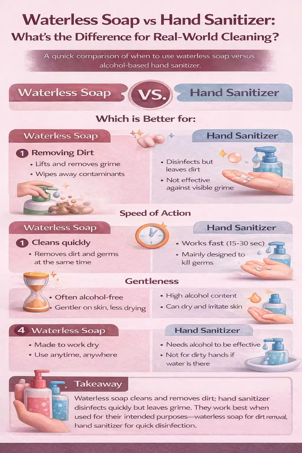 In this guide, we explain how waterless soap and hand sanitizer work, what each is designed to do, and where their limitations begin. You’ll learn when waterless soap is the better choice for removing dirt and oils, when hand sanitizer makes sense for fast disinfection, and how to choose the right option based on how dirty your hands really are. The goal is simple: help you make a practical, informed decision instead of relying on one product for every situation.